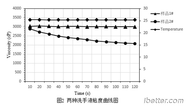 使用DV2T标准粘度计配套SSA小量样品适配器对两种洗手液进行粘度测量,为洗手液在生产过程中的粘度质量控制提供测试依据。