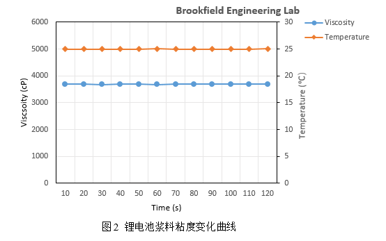 取一定量的已配置好的锂离子电池浆料于SSA的样品杯中,将转子缓慢浸没至样品中,然后连接粘度计主机和TC-650 AP水浴循环系统。在Rheocalc T 软件上编辑相应的测试程序,待样品温度稳定后开始测量。选择“Multi Point”模式进行数据采集,测试时间为120s,数据采集间隔为10s,总共采集了12个数据点,观察测试过程中粘度变化情况数据及温度控制的稳定性。
